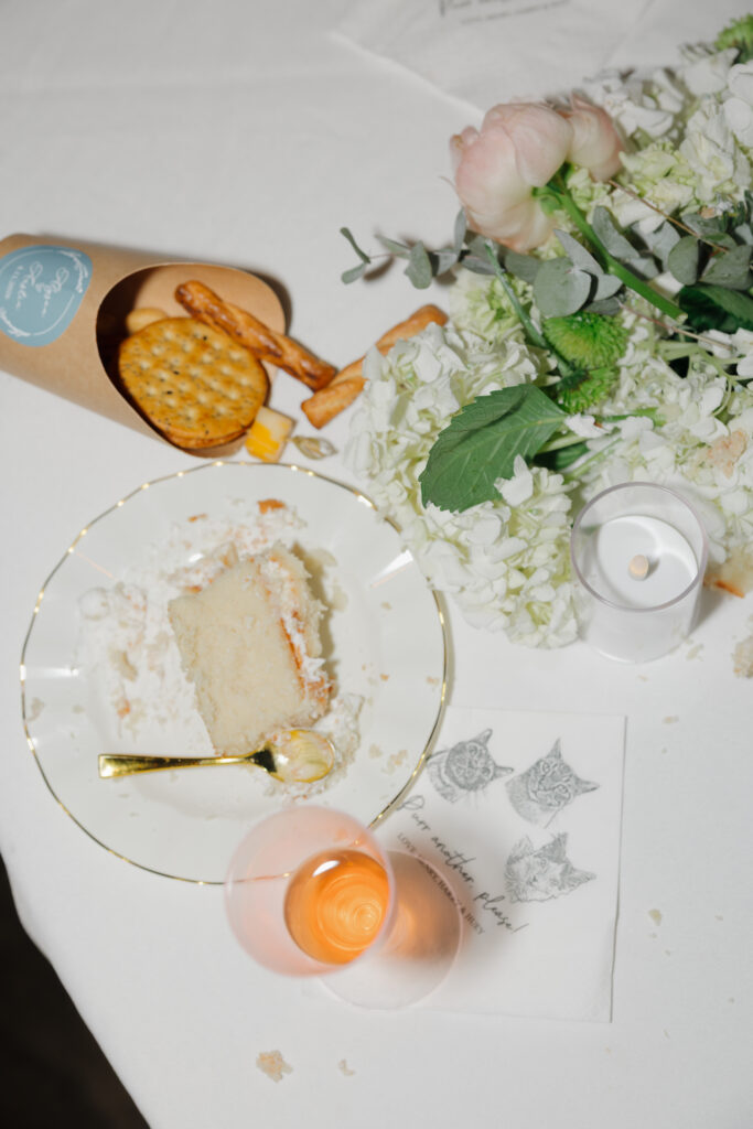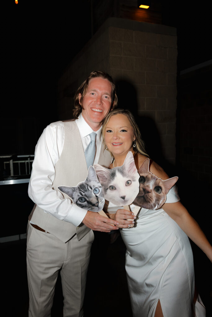 And one of the most personal touches? Cocktail napkins featuring their three cats: Henry, Harry, and Huey, plus little cut-out faces of them on sticks for the dance floor. It was fun, unique, and so them.