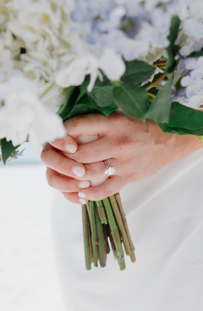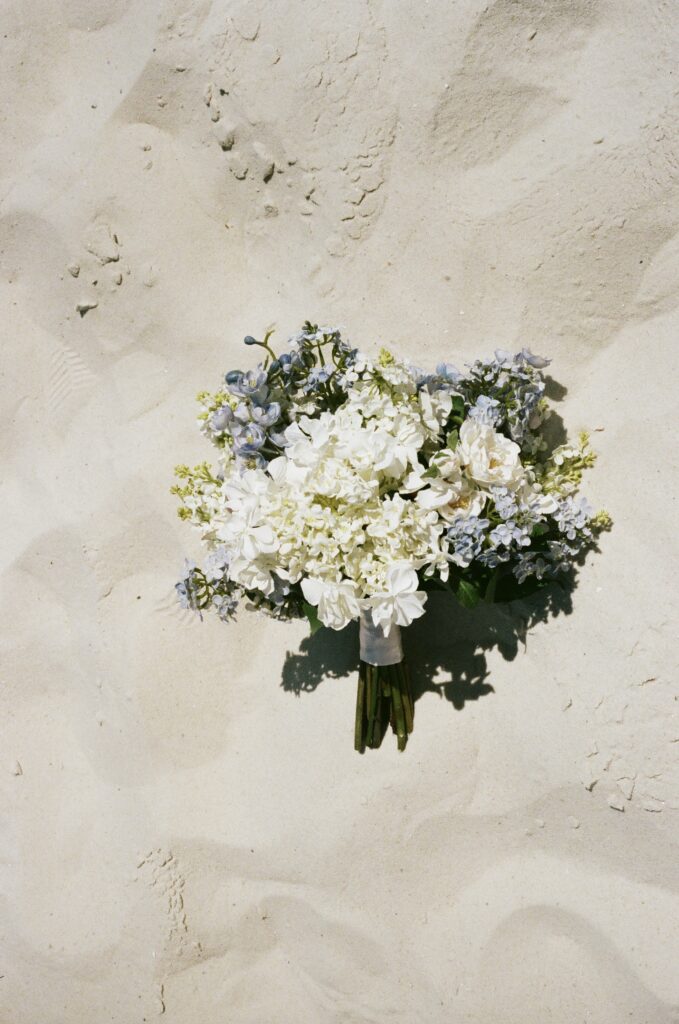 Alyson’s florals came from Something Borrowed Blooms and you truly would never know they weren’t real. The white, baby blue, and green arrangements looked incredible in person. One of the best parts? Once the wedding was over, everything could simply be shipped back, making it such a convenient and stress-free option.
