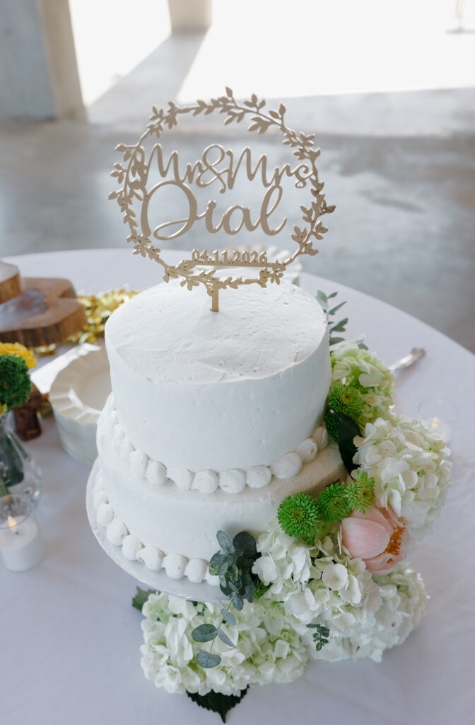 Their two-tier cake was simple and timeless, decorated with florals cascading down the side.